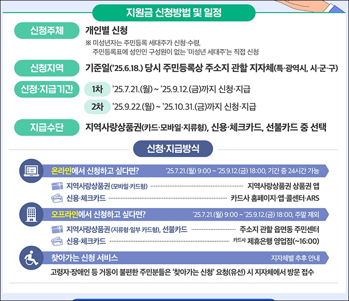 신청은 2025년 7월 21일부터 시작되며, 온라인(카드사 홈페이지, 정부 24 등) 또는 오프라인(주소지 관할 주민센터)으로 편리하게 신청할 수 있습니다.