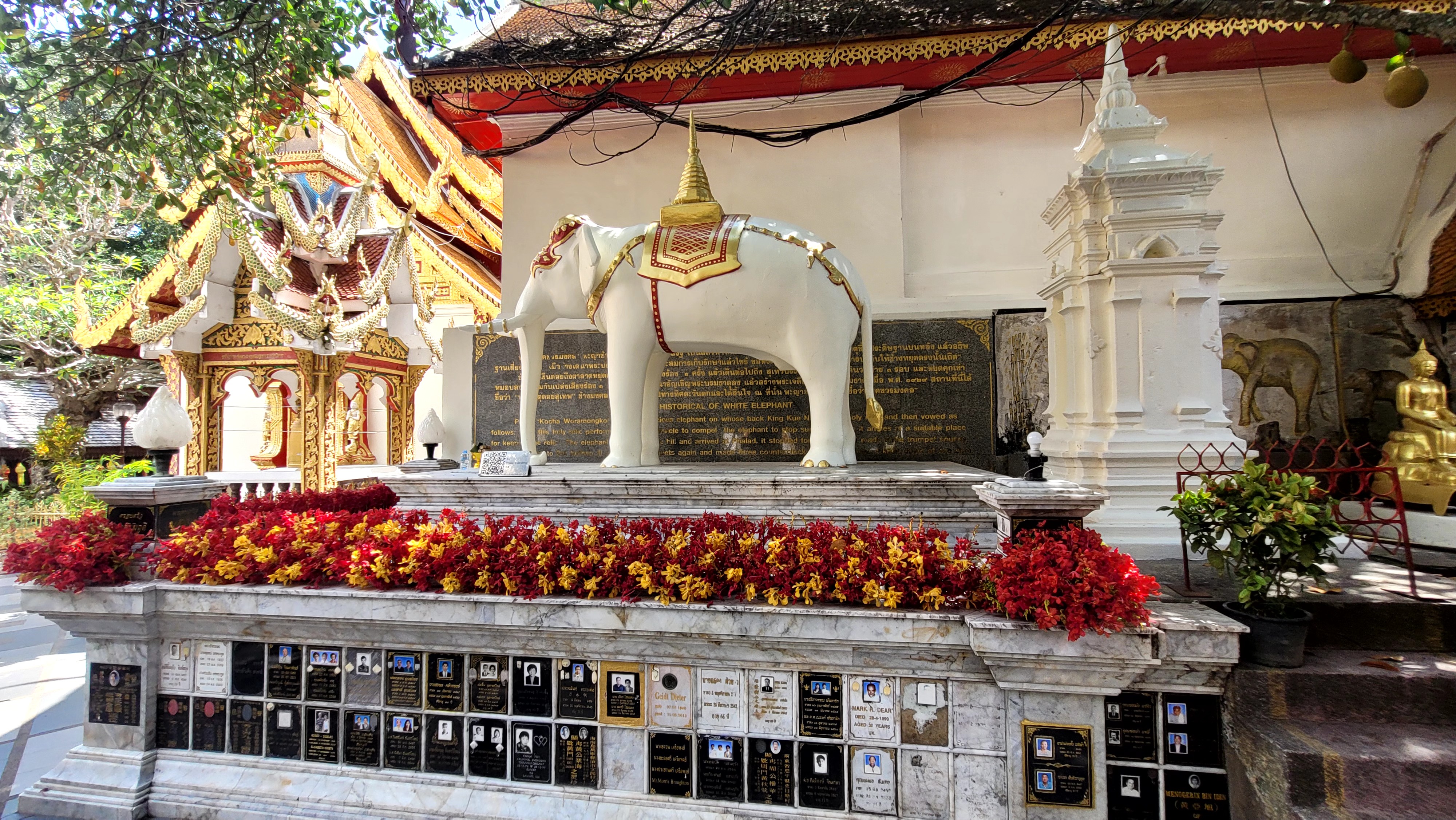 신성한 흰 코끼리에게 이 유물을 지우고 풀어졌는데, 흰 코끼리가 치앙마이 숲을 헤치고 높은 산을 오르다가, 도이수텝 산 정상에 도달한 후 세 번 울고 쓰러져 죽습니다. 왕은 이것을 신의 뜻이라 받아들이고 흰 코끼리가 쓰러진 그 자리에 사원을 세웁니다. 그 사원이 바로 왓 프라탓 도이수텝입니다.