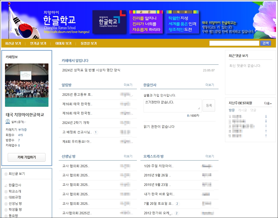치앙마이 한글학교 daum cafe를 통해 더 자세한 내용을 확인하실 수 있습니다. 매주 교사들이 올리는 학습 지도안과 행사들을 자세히 알 수 있습니다.