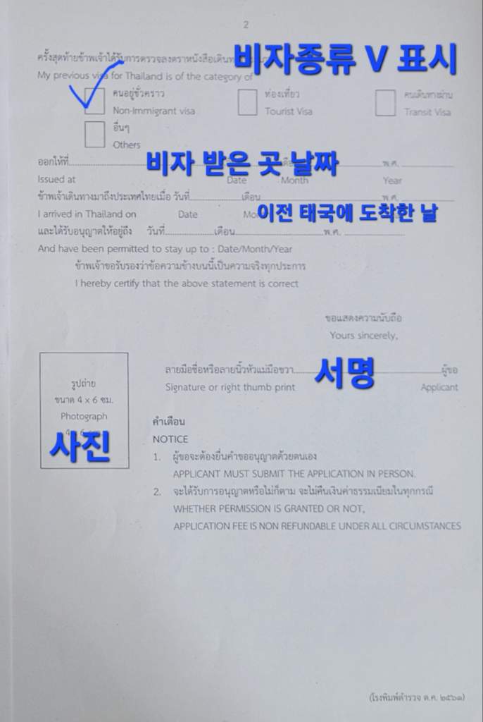 11. 이전 태국에 도착한 날을 적으시고 사진 첨부 후 서명하시면 됩니다. 사진은 최근 6개월 이내 사진으로 4X6 cm 사이즈입니다. 서명밑 빈 공간에 태국 전화번호를 적으시면 좋습니다.