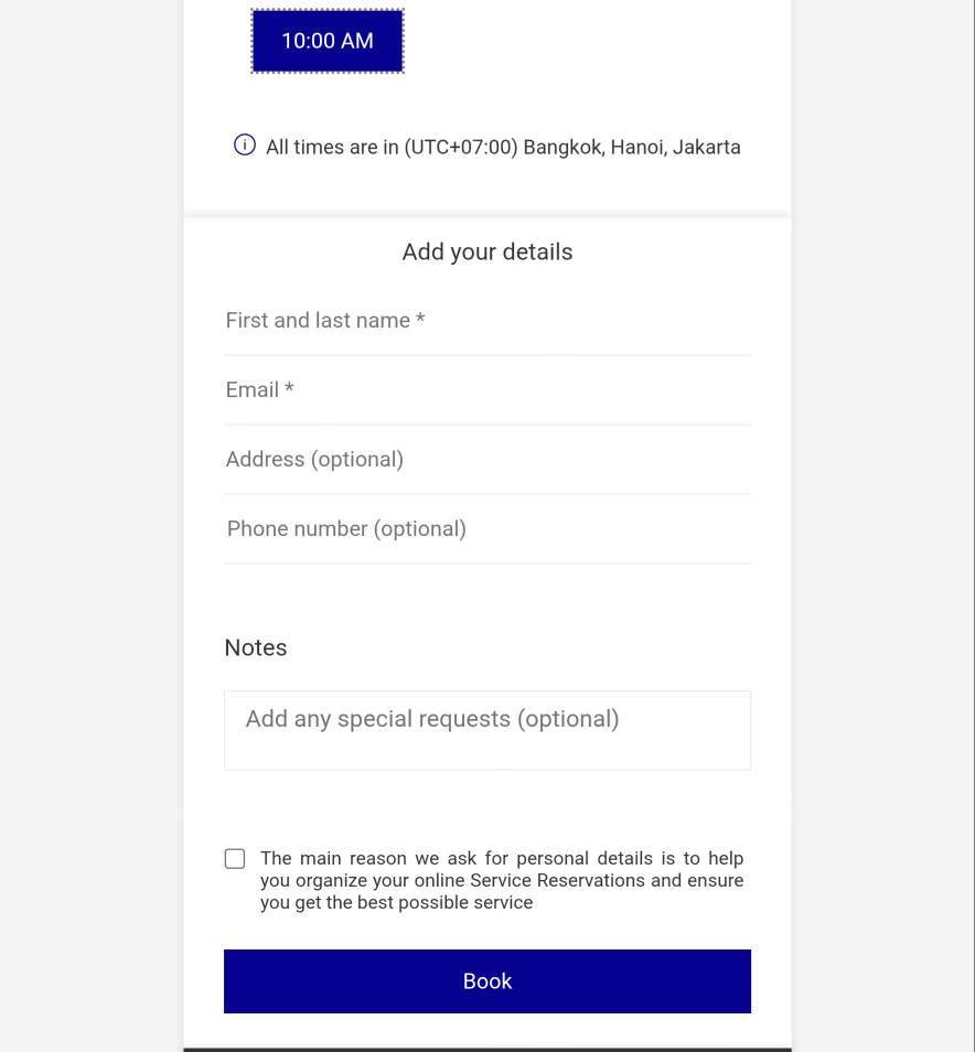 해당 날짜와 시간을 클릭하시면 세부적인 내용을 적을 수 있습니다. 이름과 성, 이메일, 주소나 전화번호(선택사항)를 적습니다. 저는 이름과 이메일, 전화번호를 입력하였습니다.