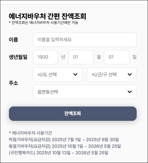 | 2025년 10월 13일 - 2026년 5월 25일 | 실물카드 (국민행복카드) | 전기. 도시가스, 등유, LPG, 연탄 | |