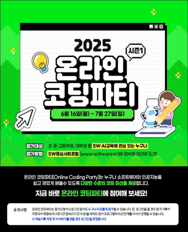2025 온라인 코딩파티에 대해 알아보았습니다. 기간이 얼마 남지 않았으니 서둘러 신청하세요.