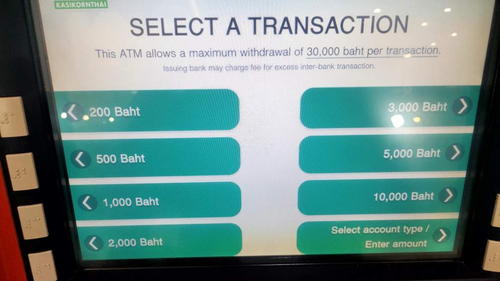 ATM 수수료는 현지 은행 수수료가 부과됩니다. 건당 220밧이 부과되므로 한 번에 필요한 금액을 충분히 인출하는 것이 여러 번 인출하는 것보다 좋습니다.